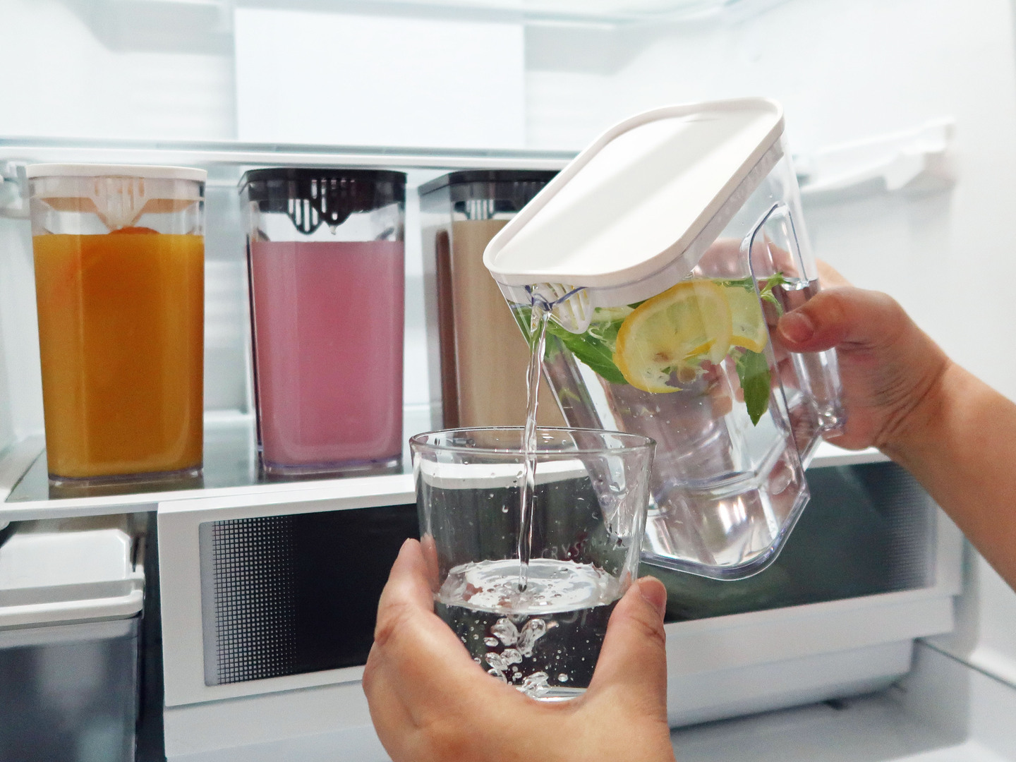 「スマート冷水筒」は、容量1.1L、高さ16cmのコンパクトなウォーターピッチャーです。取っ手がないシンプルな形で、冷蔵庫の扉ポケットにも、棚にも置ける収納のしやすさと、サッと持って注げる取り回しの良さから、2024年の発売以来、好評をいただいております。